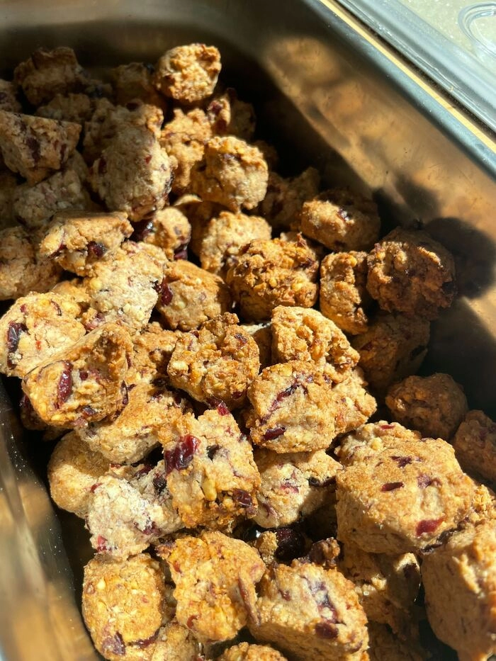 Veganski pirini piškoti z brusnicami so ročno narejeni na ekološki kmetiji Potočnik – Poprask iz skrbno izbranih lokalnih sestavin. Polnozrnata pirina moka in naravne brusnice jim dajejo prijetno rahlo kiselkast okus. So preprost in okusen prigrizek, primeren za vse, ki imajo radi veganske in domače sladice.